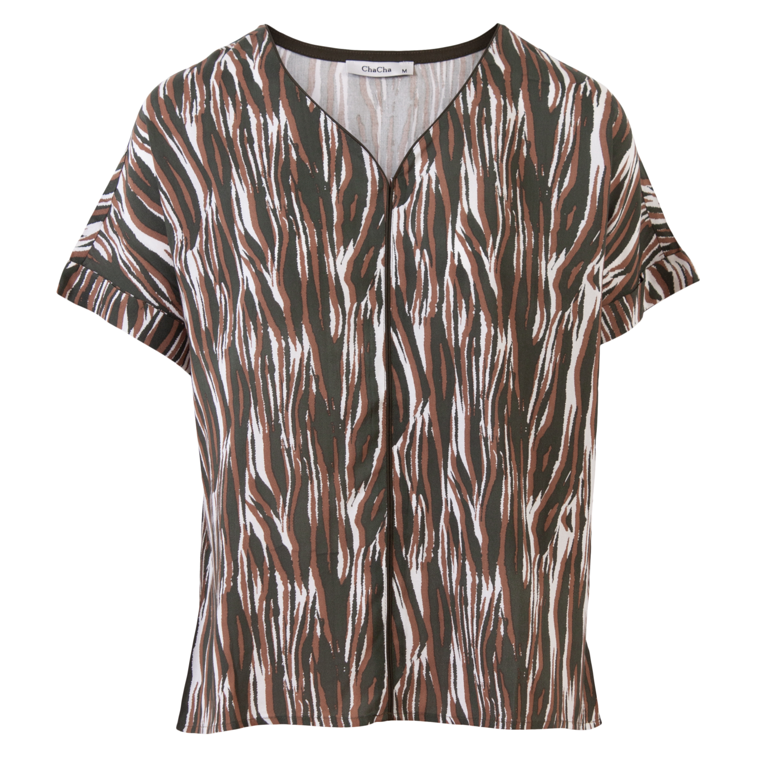 Vi har fundet Chacha Dame Bluse – Khaki – fra Chacha hos dansk.dk i kategorien Bluse. ChaCha dame kortærmet bluse med all-over print og V-udskæring.